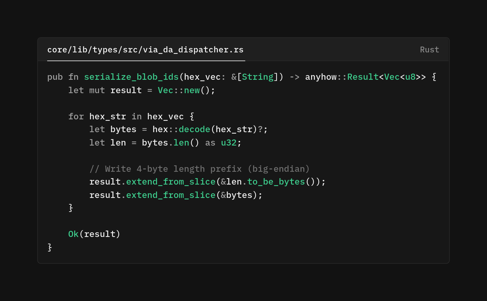 We're using bincode. Bincode produces compact binary representations without the overhead of field names or schema descriptors, for data that's going to be posted to a blockchain where every byte costs gas (or, in Celestia's case, contributes to namespace congestion). The from_bytes method returns Option<Self> rather than panicking on failure. If we somehow receive corrupted data or data from a future version of the code that serializes differently, we want to handle it 'gracefully' rather than crashing the node. The caller can decide whether to retry, log an error, or fail the operation based on what happens.