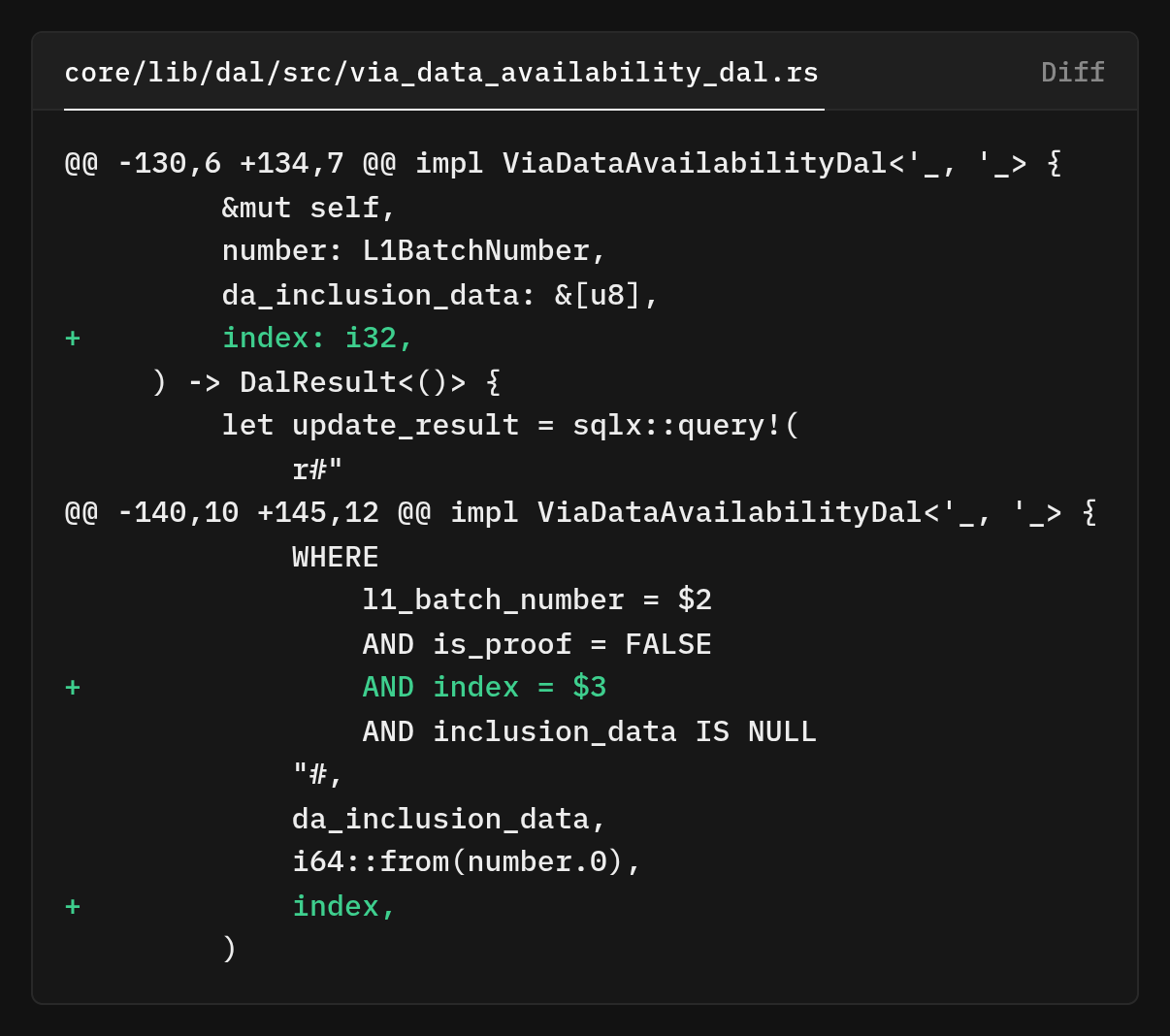The insert_l1_batch_da method now takes a index parameter that identifies which chunk of the batch this blob represents. The ON CONFLICT DO NOTHING clause is important, it makes the insertion idempotent.