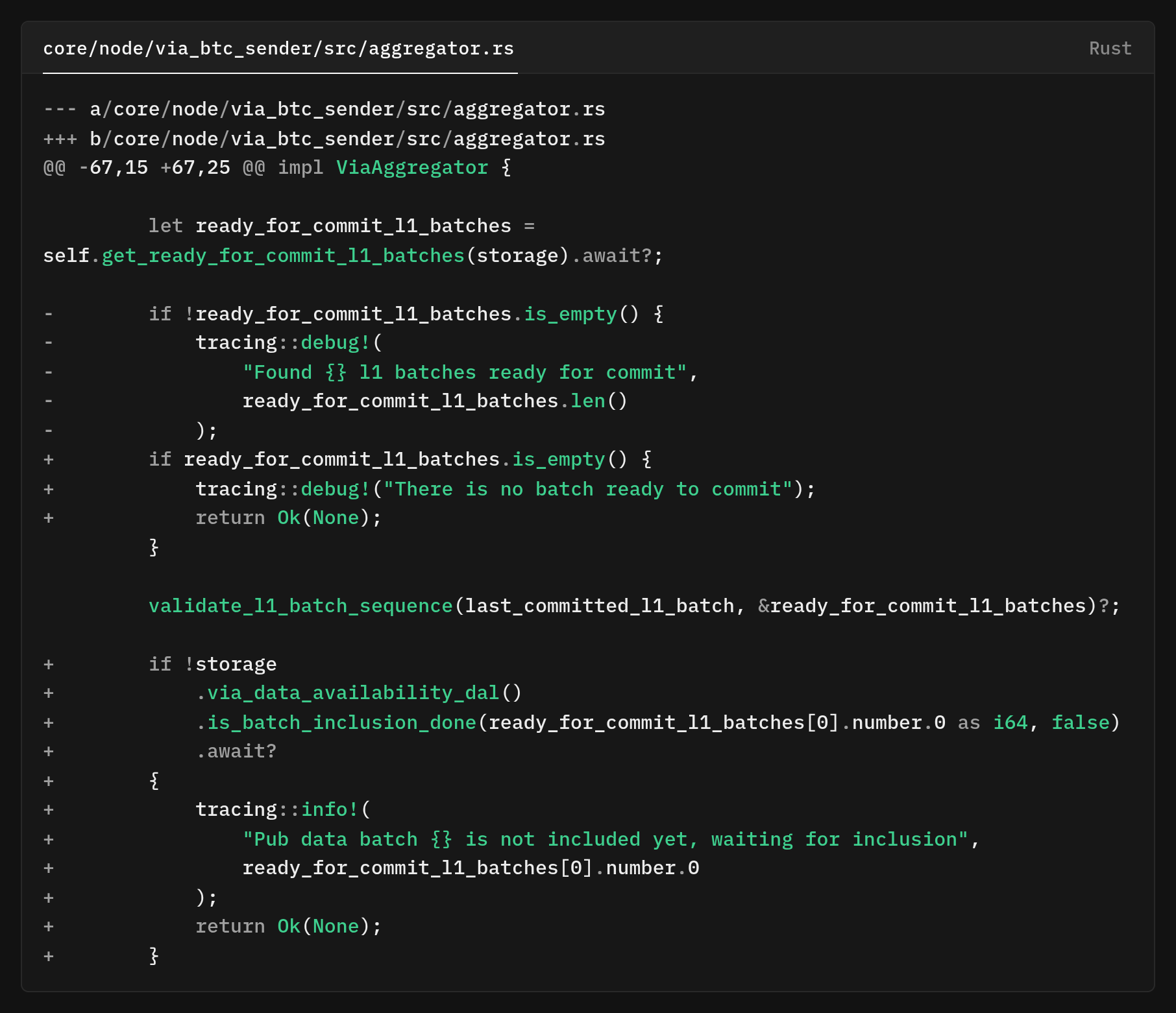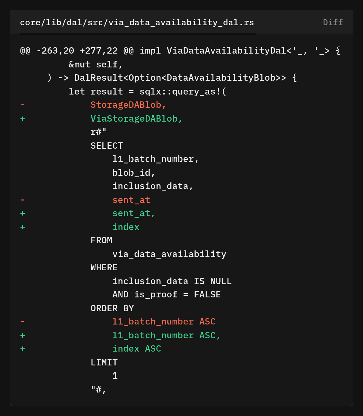 This ordering matters because the inclusion data fetcher needs to know whether a batch has been fully processed before moving on, and processing chunks out of order would complicate that logic. The most interesting query addition is is_batch_inclusion_done, which checks if all chunks have inclusion data