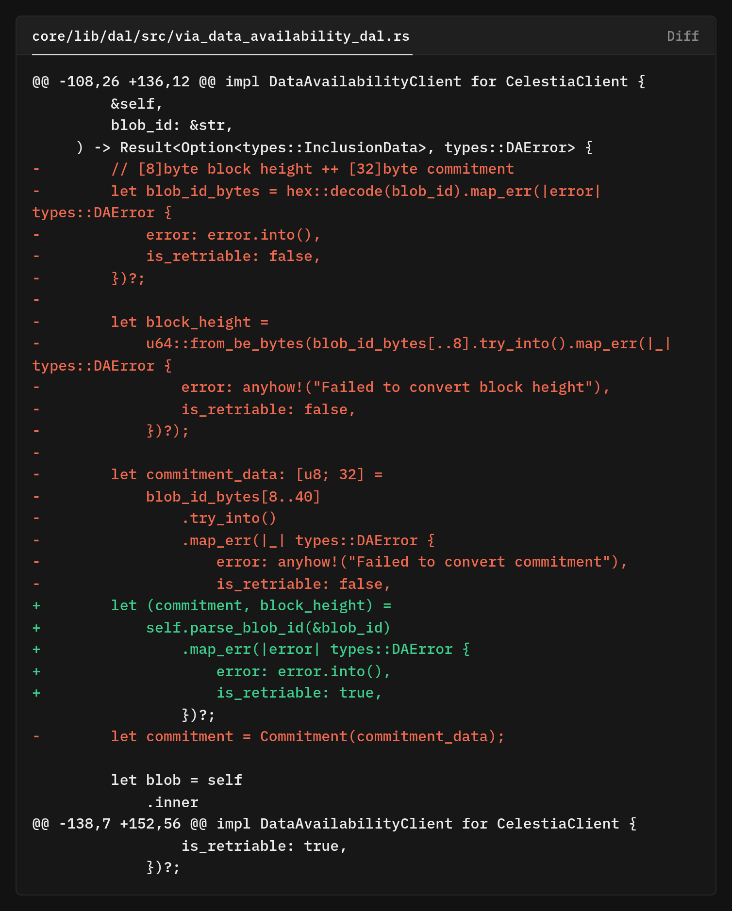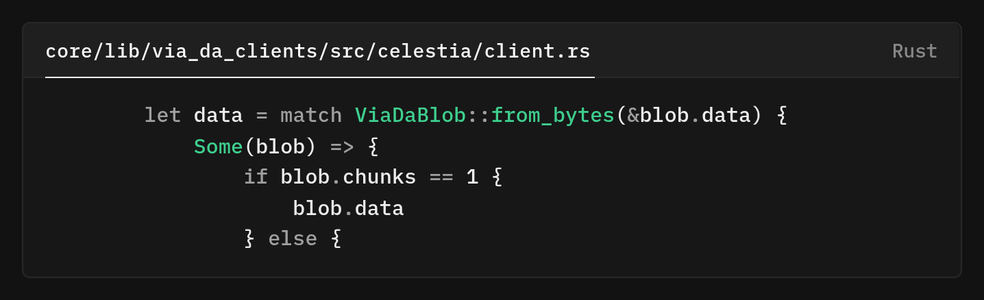 If deserialization succeeds and chunks is 1, this is a single-chunk blob, we unwrap the data and return it. This maintains perfect backward compatibility with blobs created before chunking support was added. Old blobs won't deserialize as ViaDaBlob, so they fall through to the None arm, which returns the raw blob data unchanged.