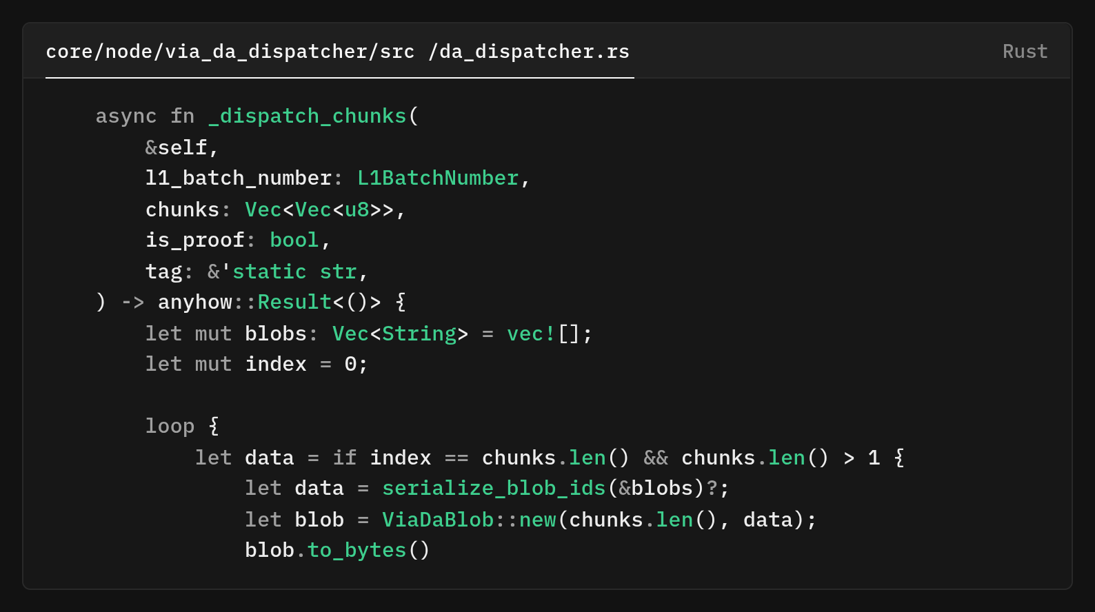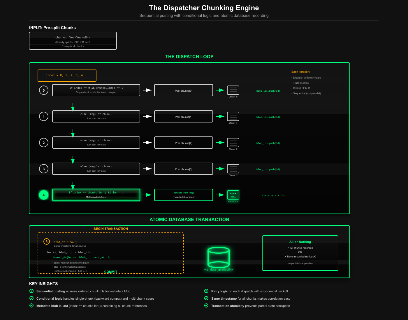 Either all chunks of a blob are on Celestia with inclusion proofs, or the batch is not considered finalized. There is no "partial availability" state. This required careful coordination between the dispatcher, who creates chunks, and the aggregator, who checks for completion before moving forward with Bitcoin inscriptions.