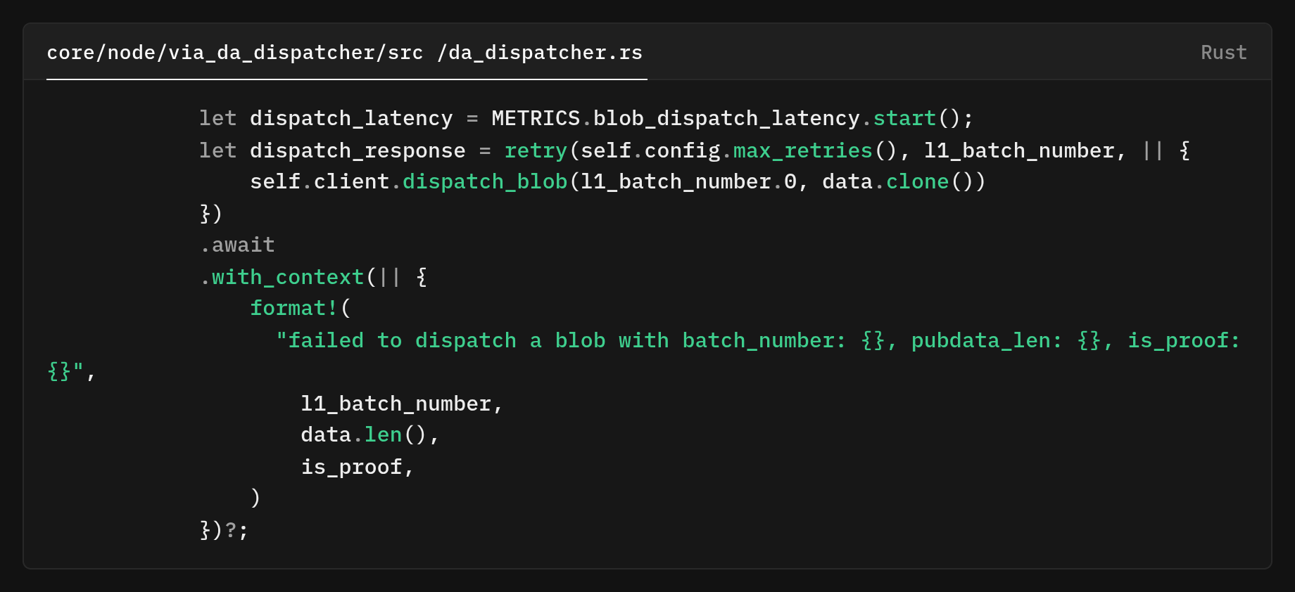 For regular chunk blobs (not the first or final), we use raw chunk data. Dispatch is wrapped in retry logic with exponential backoff, and we collect latency metrics. Error messages include batch number, data length, and proof data status for debugging.