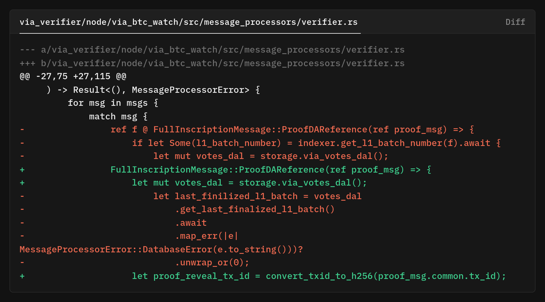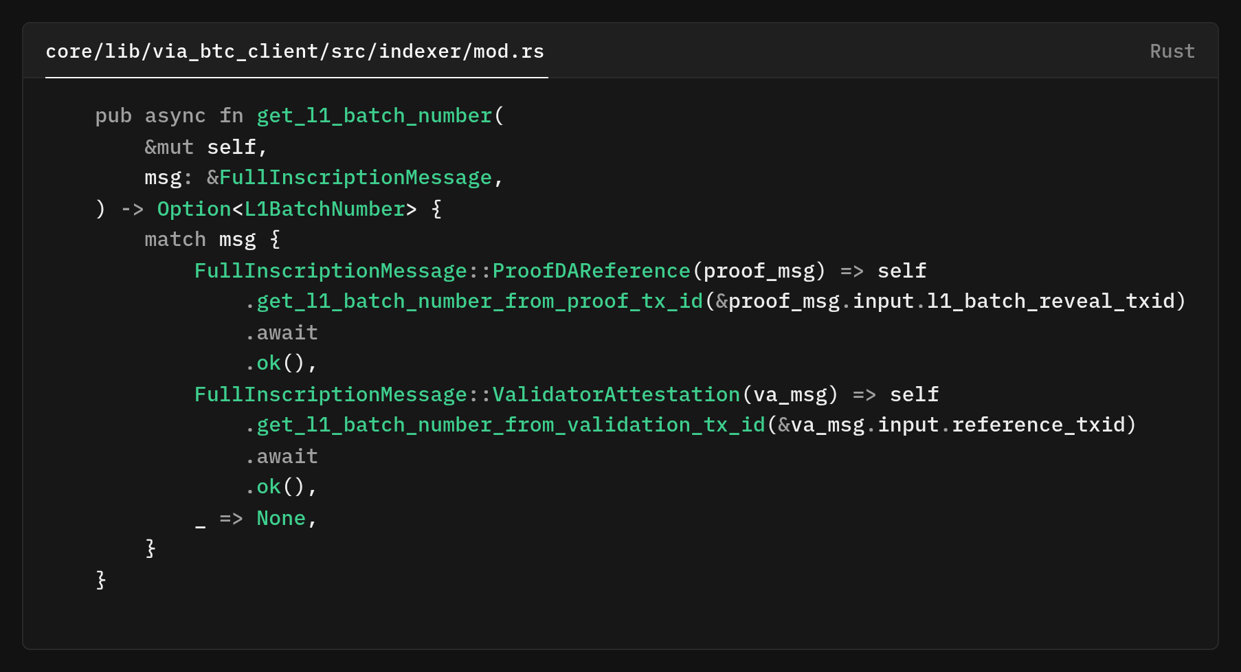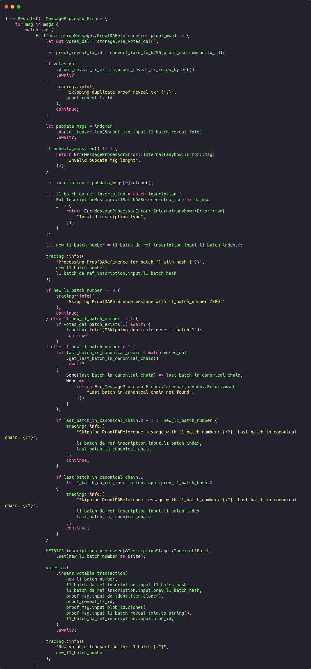 The original verifier code pulled the batch number by calling the indexer rather than reading it directly from the message payload that was already in hand. You can see this where the processor gated its logic behind f let Some(l1_batch_number) = indexer.get_l1_batch_number(f).await {.