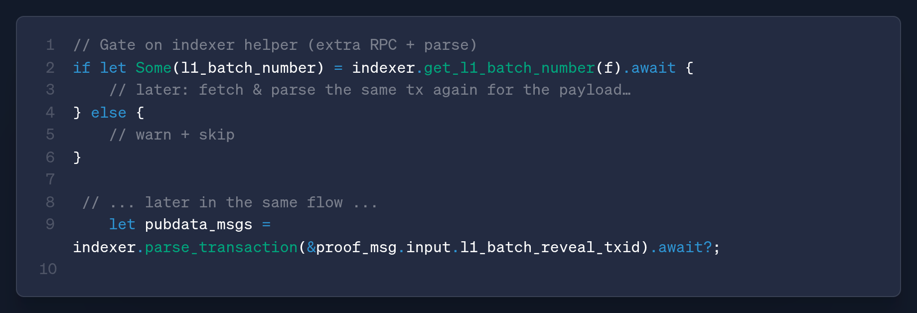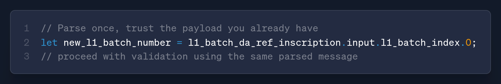 - One‑pass parsing: Parse the reveal transaction once. Derive the batch number from the same parsed payload.