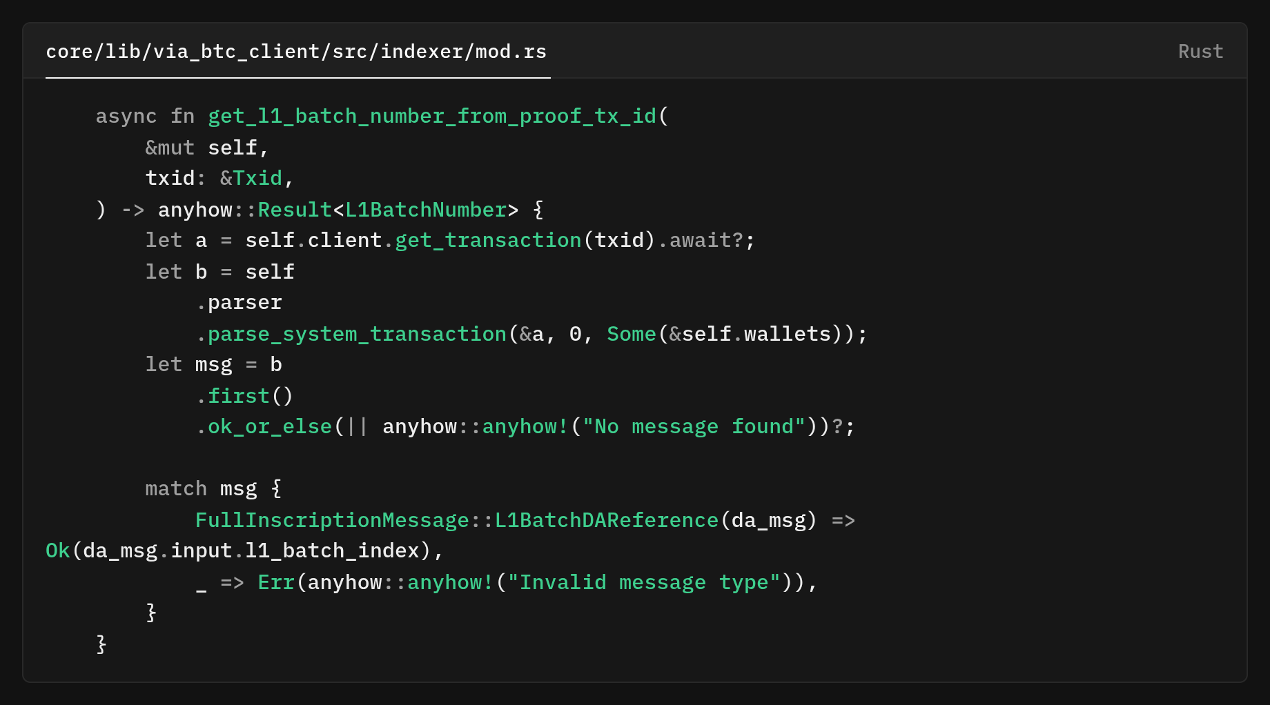 That helper get_l1_batch_number does not read from a separate cache or mapping. It makes a fresh Bitcoin RPC call to fetch the reference transaction and then parses it to recover the batch index via get_l1_batch_number_from_proof_tx_id which itself runs the parser over the transaction.