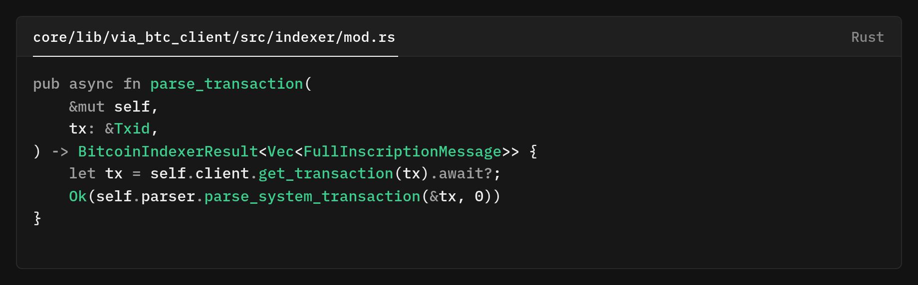 This fetches the tx from the Bitcoin node, and it's a one-round-trip to get the raw transaction by its Txid. The self.parser.parse_system_transaction(&tx, 0) runs the parser once and returns a vector of FullInscriptionMessage value found in that transaction. The 0 is a parser context/flag value.