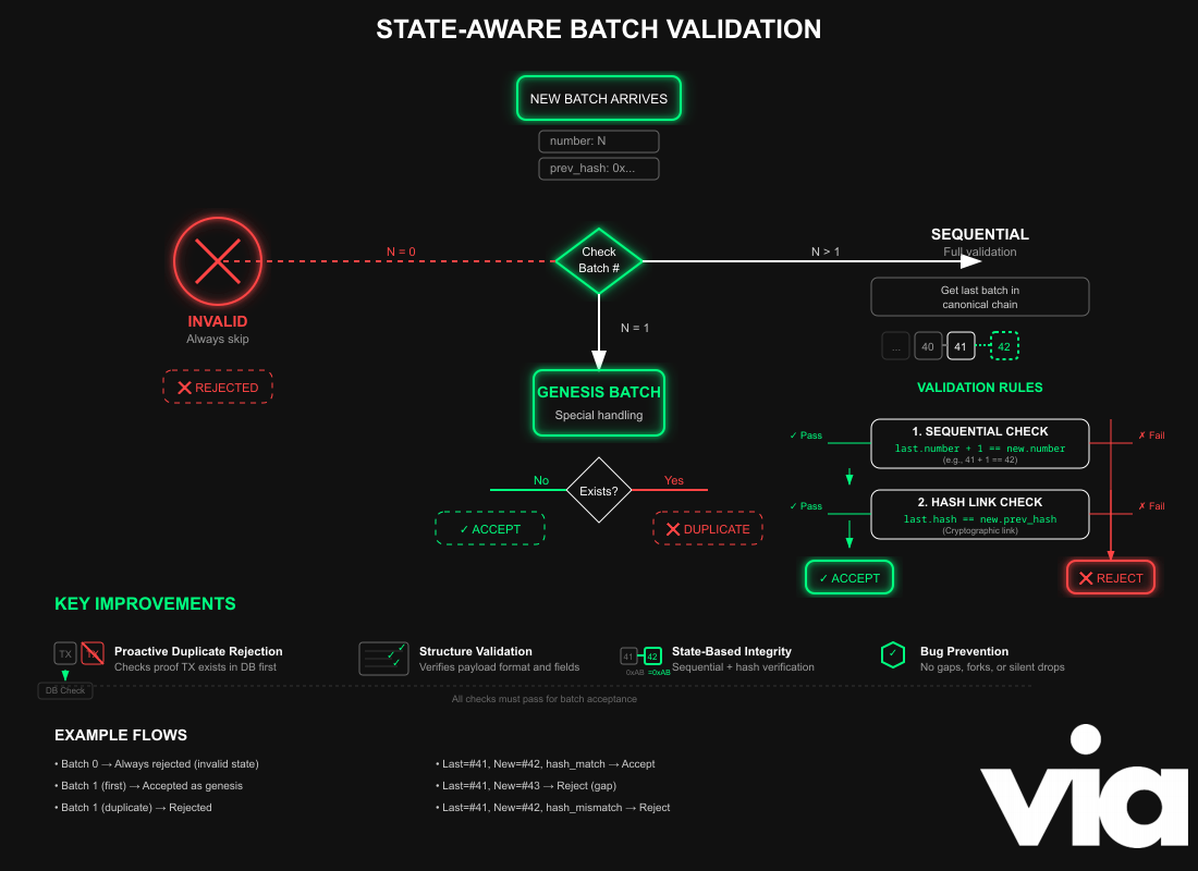 We've rolled out yet another major upgrade to the Via Verifier Network, which makes chain progression more reliable under load while reducing network overhead by half during batch ingestion. The upgrade also strengthens chain integrity and closes a subtle TOCTOU window, which makes head selection deterministic.