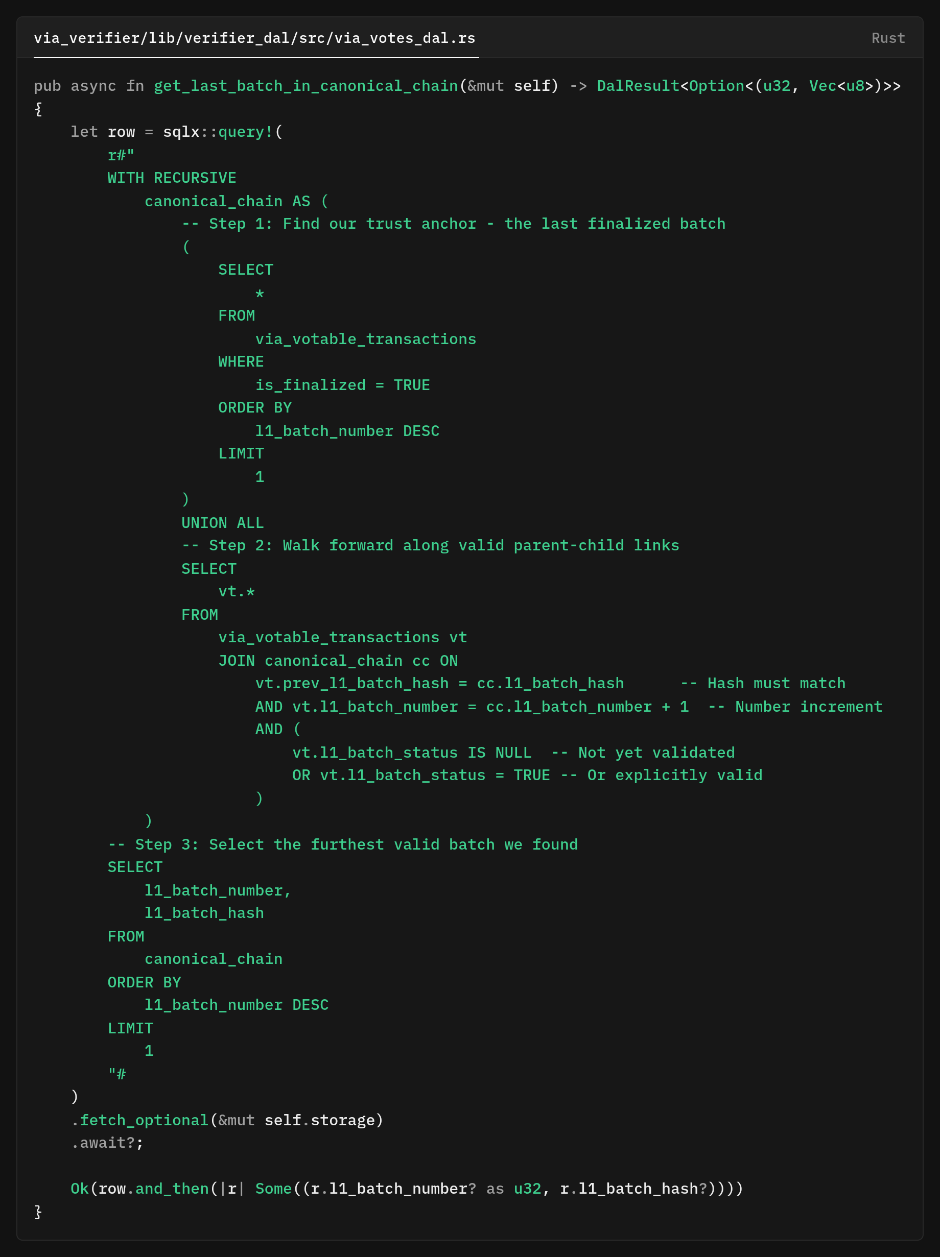 l1_batch_status IS NULL OR TRUEthe recursion won’t traverse batches marked invalid. This is crucial during recovery/reorg scenarios. - Finalized-anchored. Finalization is used as a trust root; the recursion builds only on top of that root. If there is no finalized batch, the absence is explicit, and the caller can treat the system as “pre-genesis” or the bootstrap phase.